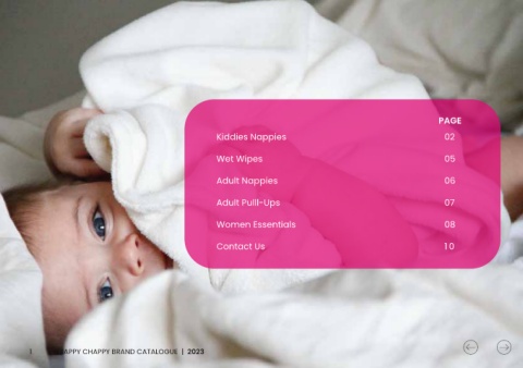 PAGE Kiddies Nappies 02 Wet Wipes 05 Adult Nappies 06 Adult Pulll-Ups 07 Women Essentials 08 Contact Us 10 1 NAPPY CHAPPY BRAND CATALOGUE | 2023