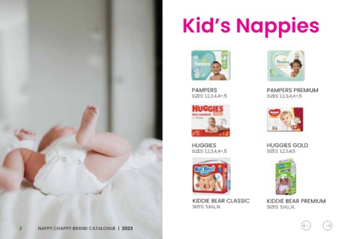 Kid’s Nappies PAMPERS PAMPERS PREMIUM SIZES: 1,2,3,4,4+,5 SIZES: 1,2,3,4,4+,5 HUGGIES HUGGIES GOLD SIZES: 1,2,3,4,4+,5 SIZES: 1,2,3,4,5 KIDDIE BEAR CLASSIC KIDDIE BEAR PREMIUM SIZES: S,M,L,XL SIZES: S,M,L,XL 2 NAPPY CHAPPY BRAND CATALOGUE | 2023